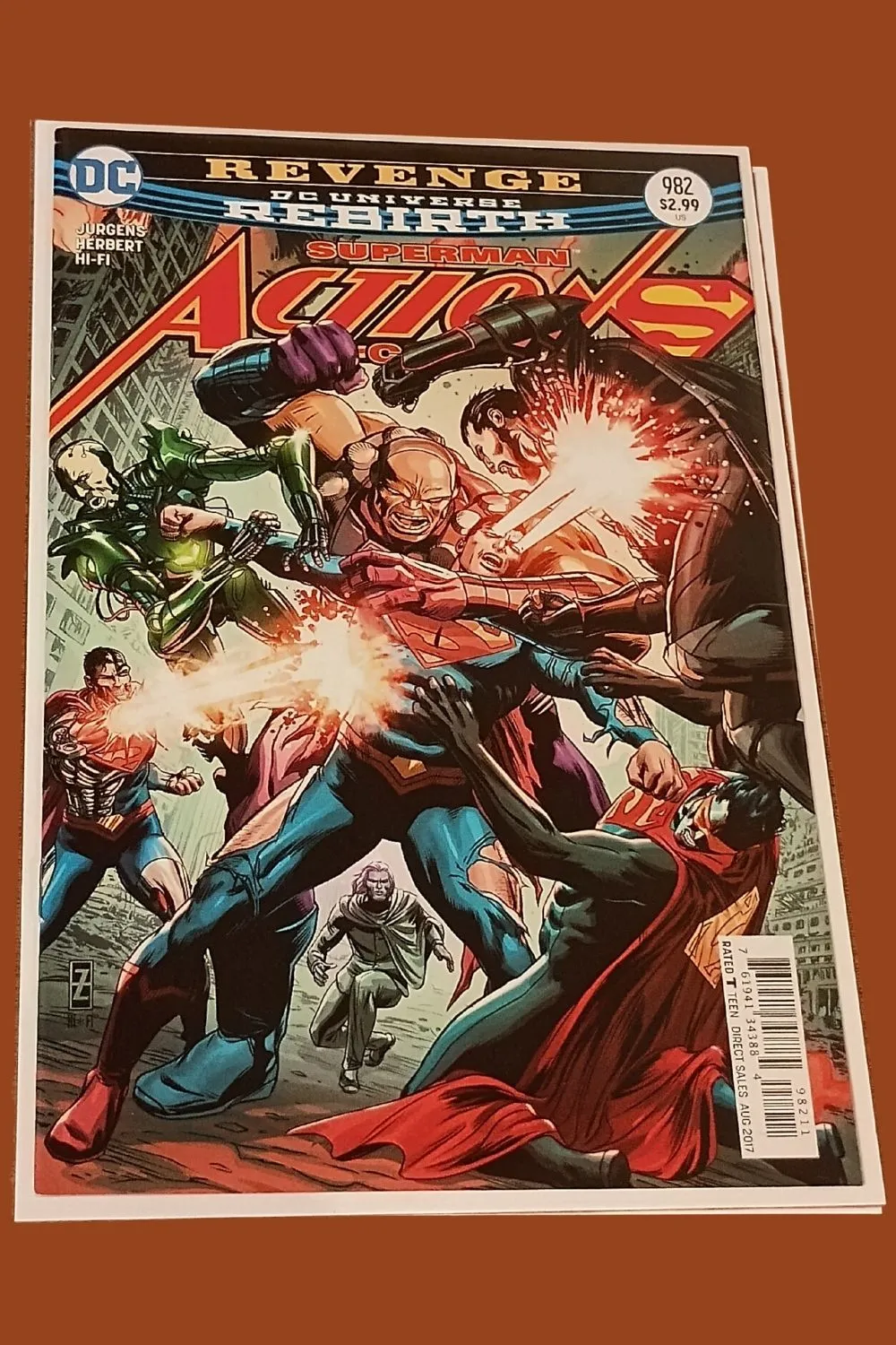 The battle for Earth’s future explodes in Action Comics #982, the high-octane Part 4 of “Revenge” from the DC Universe Rebirth era. Written by Dan Jurgens with art by Jack Herbert and Hi-Fi, this issue delivers an all-out war between Superman and the combined forces of his greatest enemies.