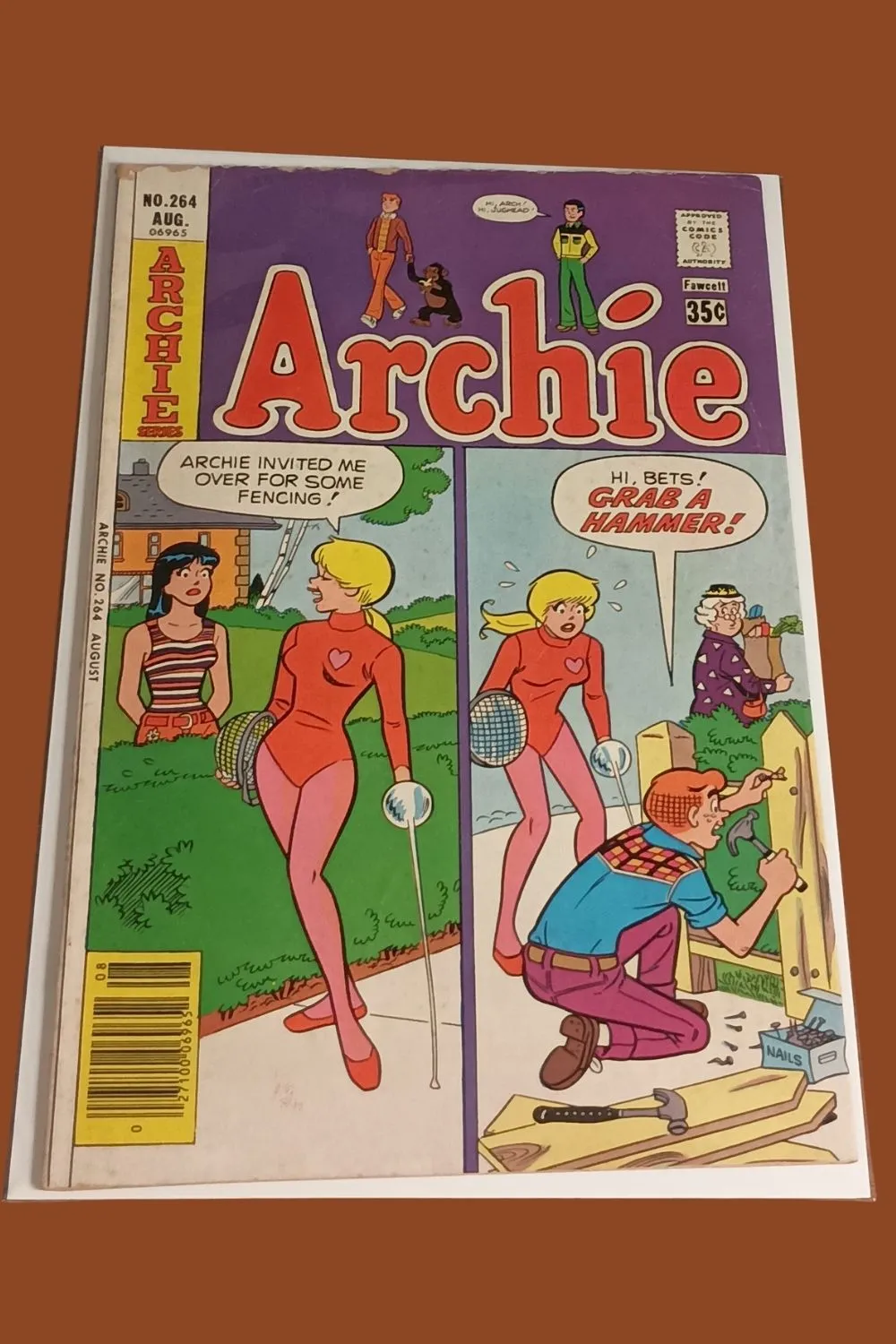 Enjoy classic Riverdale wordplay with Archie #264 (August issue) featuring a clever split-panel cover packed with vintage Archie humor! This Bronze Age Archie comic delivers a hilarious pun as Archie invites Betty over for some βfencingβ β but not the kind she expected.