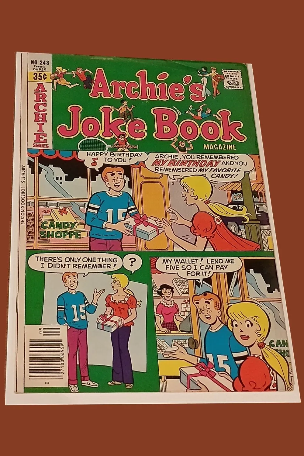 Celebrate classic laughs and timeless teenage humor with Archie’s Joke Book #248! In this hilarious 1976 issue, Archie tries to impress Betty by remembering her birthday — and her favorite candy — only to forget one tiny detail: his wallet! It’s a perfect example of Archie’s lovable mix of charm, clumsiness, and good intentions gone sideways.