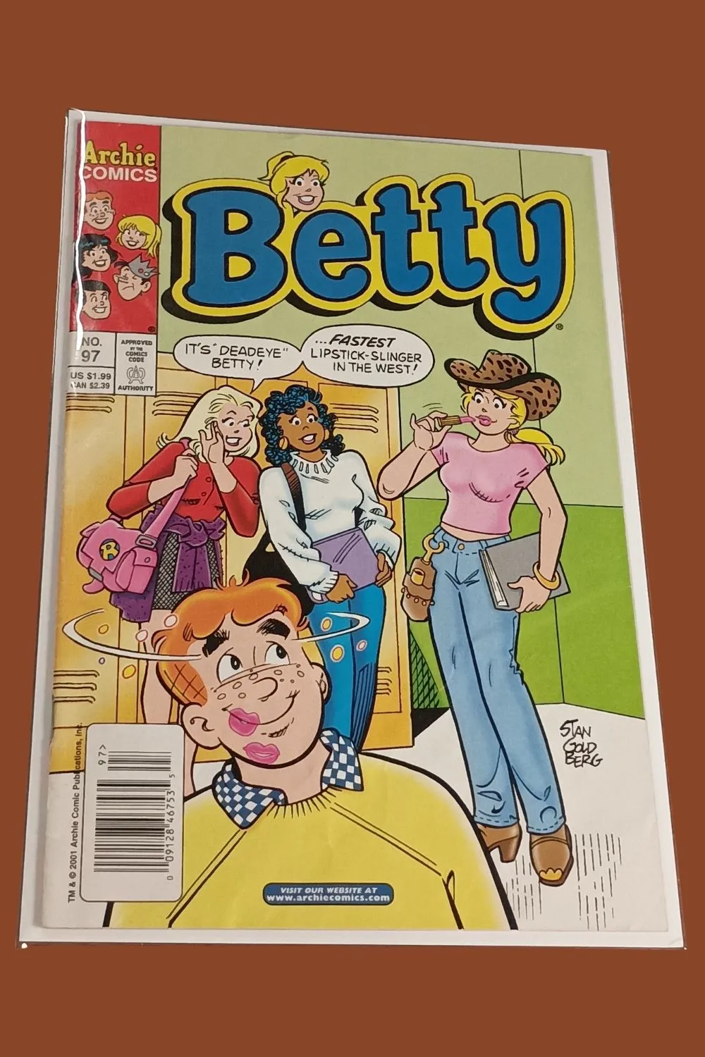 Add some playful Riverdale humor to your collection with Betty #97 (2001) from Archie Comics! This fun early-2000s issue features a memorable Western-themed cover with Betty earning the nickname “Fastest Lipstick-Slinger in the West,” delivering classic Archie-style comedy and charm.