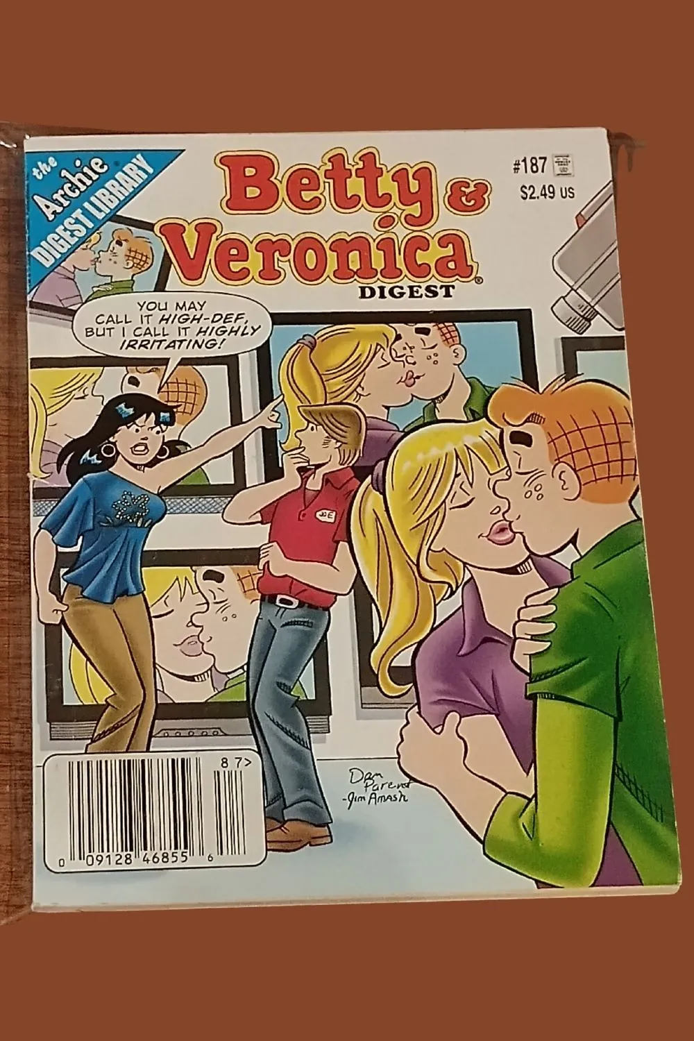 Add a lively and collectible Riverdale moment to your shelf with Betty & Veronica Digest #187. This fun issue spotlights the iconic Archie–Betty–Veronica love triangle, captured in a modern twist as Veronica complains about “high-def” broadcasting… but really finds it highly irritating to see Betty and Archie kissing on every TV screen.
