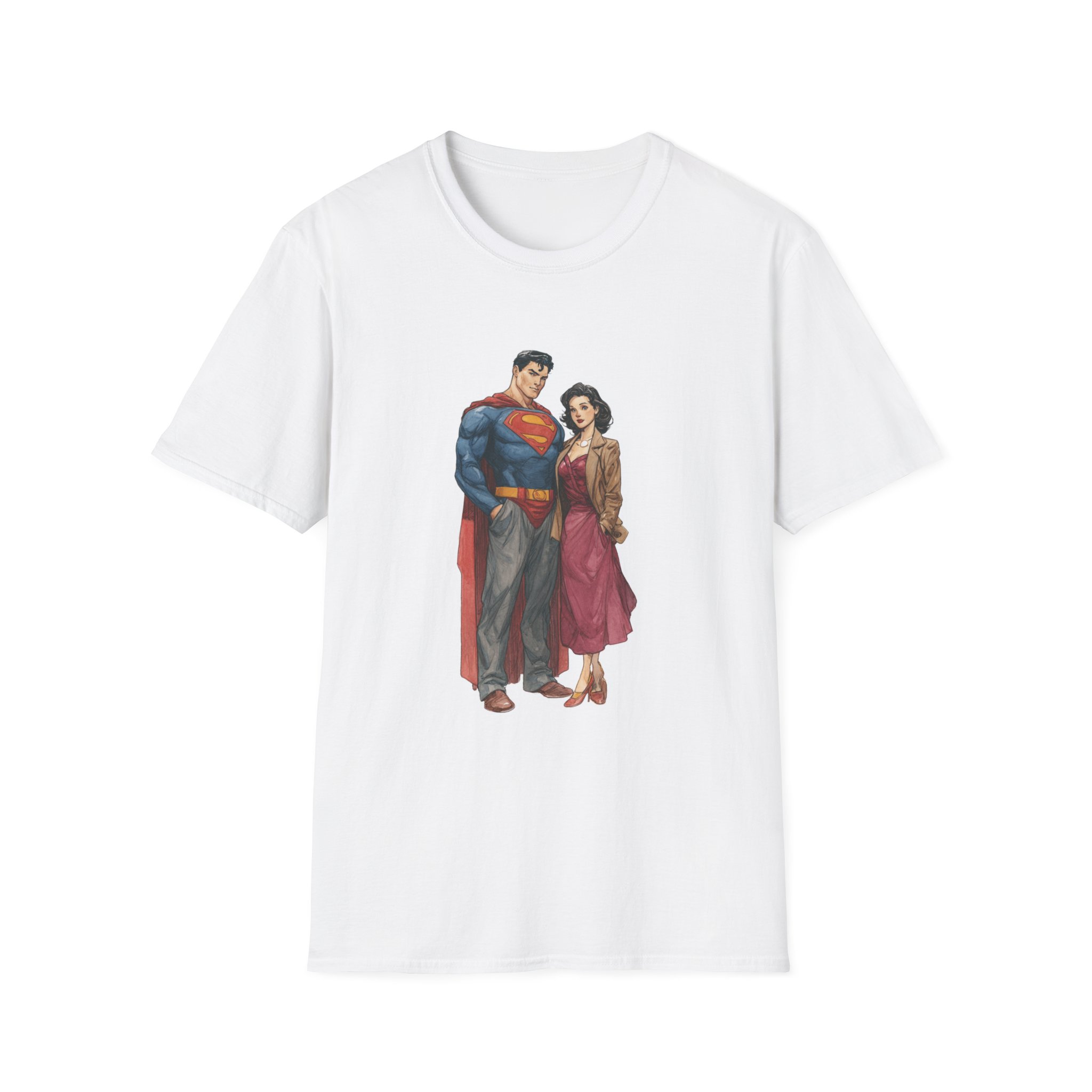 Perfect for fans of classic hero tales, vintage comic art, and iconic power couples, this shirt delivers a striking look that stands out without saying a word. The dynamic contrast between heroism and everyday elegance makes it a unique and eye-catching addition to any wardrobe.