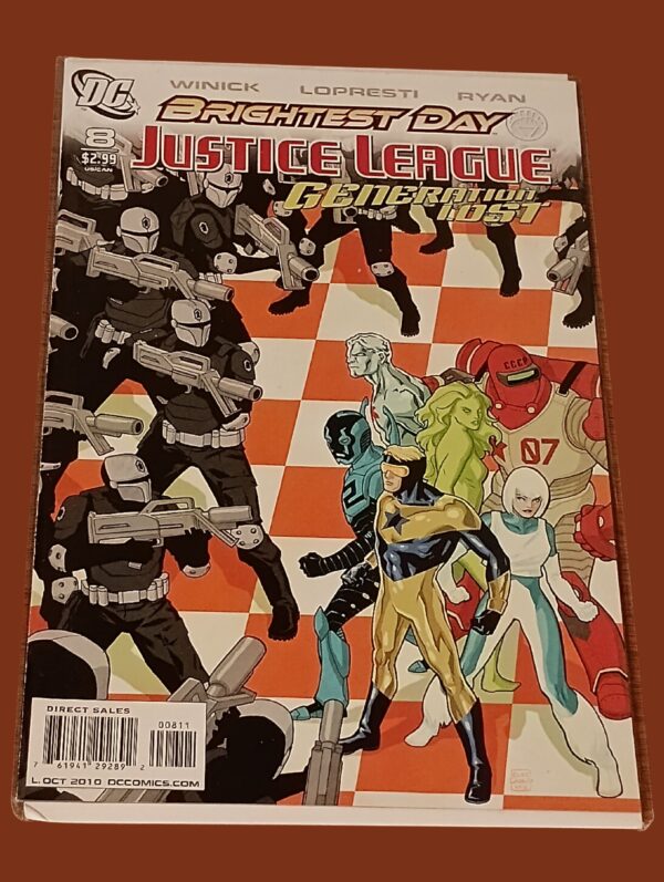 The stakes rise on a global scale in Justice League: Generation Lost #8 (2010), a direct tie-in to DC’s epic Brightest Day saga. Written by Judd Winick with art by Joe Bennett and Aaron Lopresti, this issue continues the hunt for Maxwell Lord, as Booster Gold and his rogue JLI teammates take the fight to Checkmate.