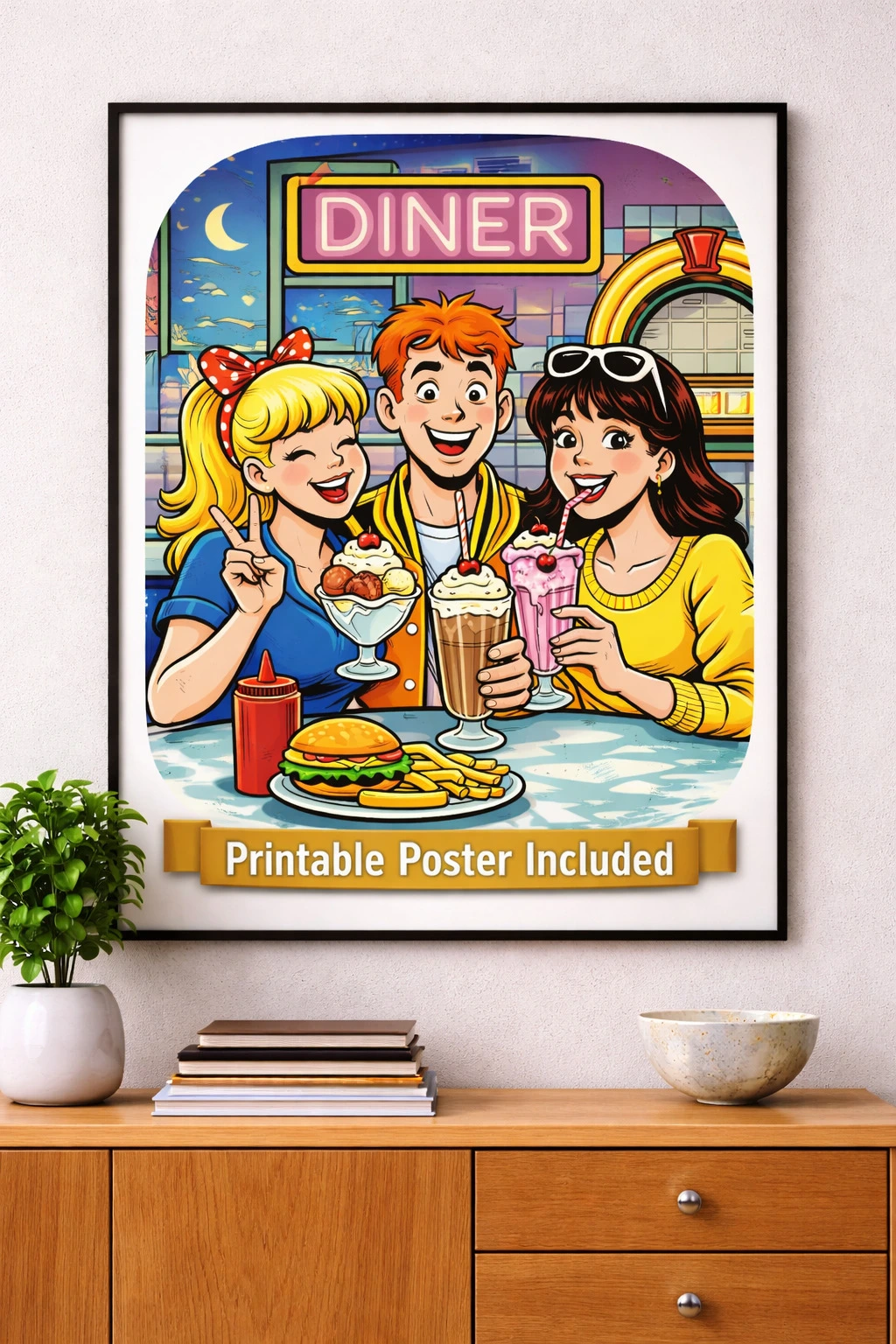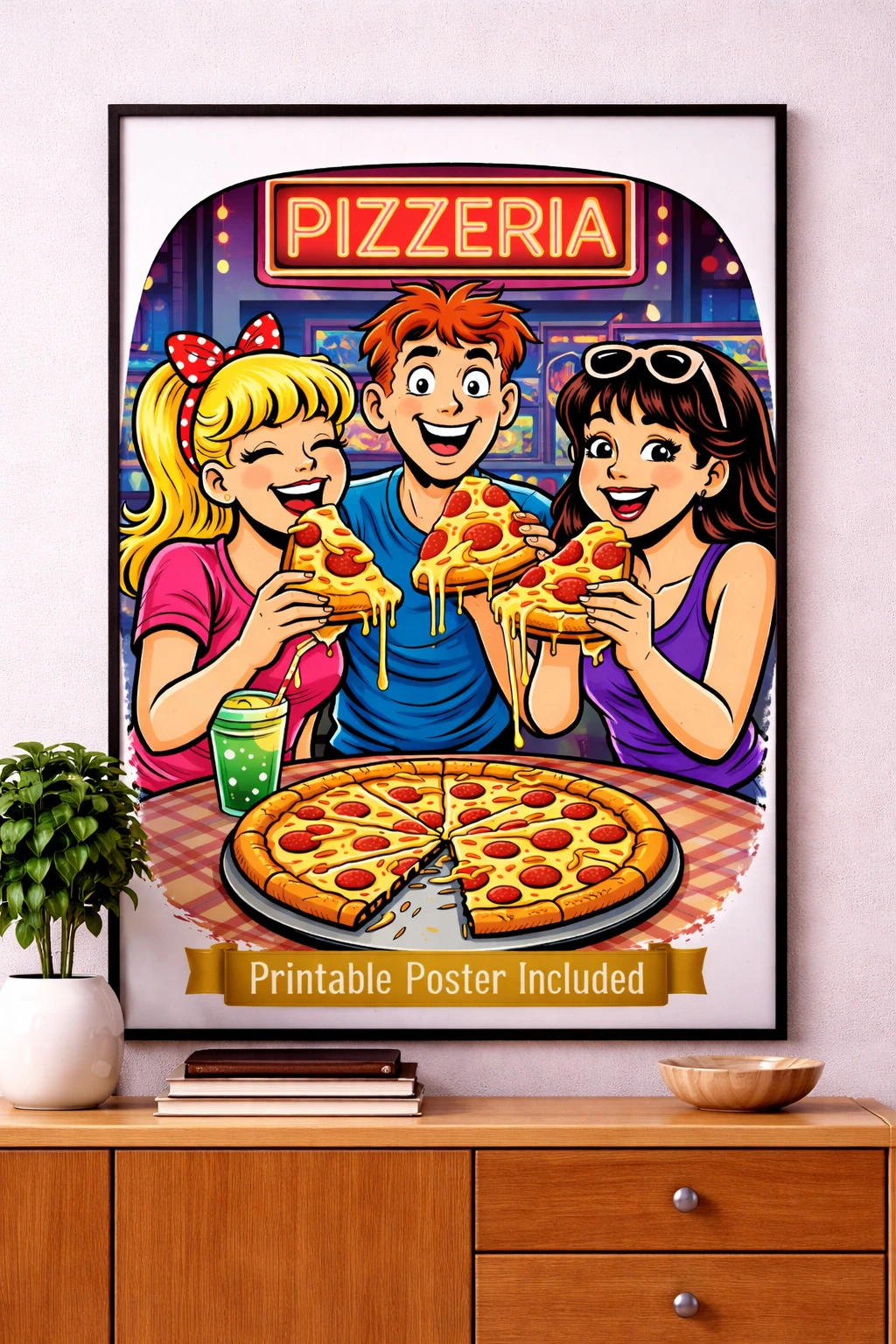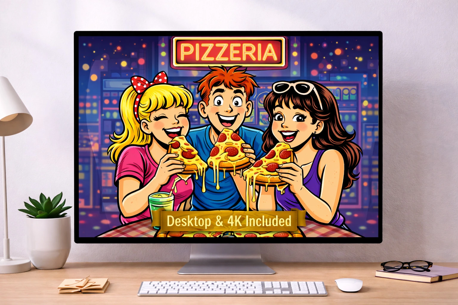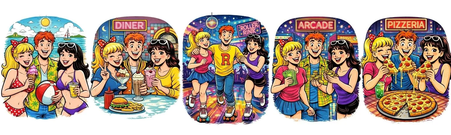 This retro-inspired digital art pack brings together five vibrant designs capturing the energy of beach days, arcade nights, roller rinks, diners, and late-night pizza runs. Each piece is packed with nostalgic charm and bold cartoon style, making it perfect for adding personality to your space or your screens.