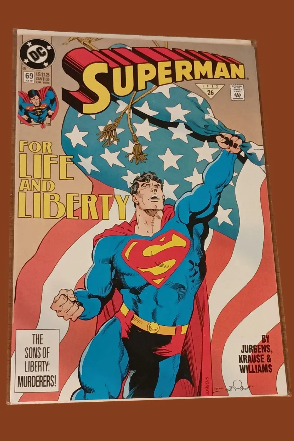 Inside, the story dives into the intense conflict with The Sons of Liberty, bringing action, moral weight, and high-stakes drama—hallmarks of early-90s Superman storytelling. Collectors of Superman comics, patriotic covers, and Jurgens-era DC will especially appreciate this standout issue.