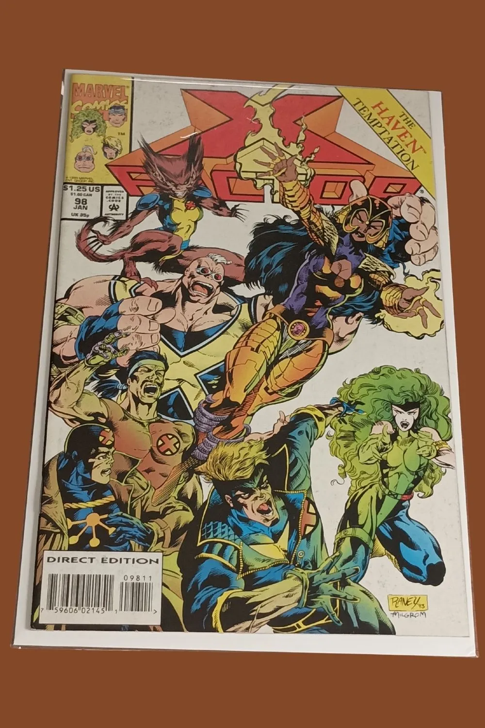 Featuring multiple team members in dynamic poses and the intriguing storyline βThe Haven Temptation,β this comic delivers nostalgia, colorful visuals, and strong collector appeal. The Direct Edition marking adds extra desirability for completists building full X-Factor or X-Men runs.